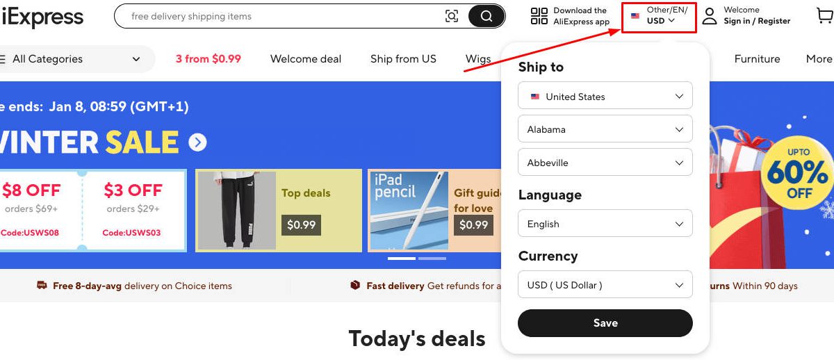 Aliexpress usually automatically sends you to your local page. If this is not the case you can easily set up your preferences from main menu: