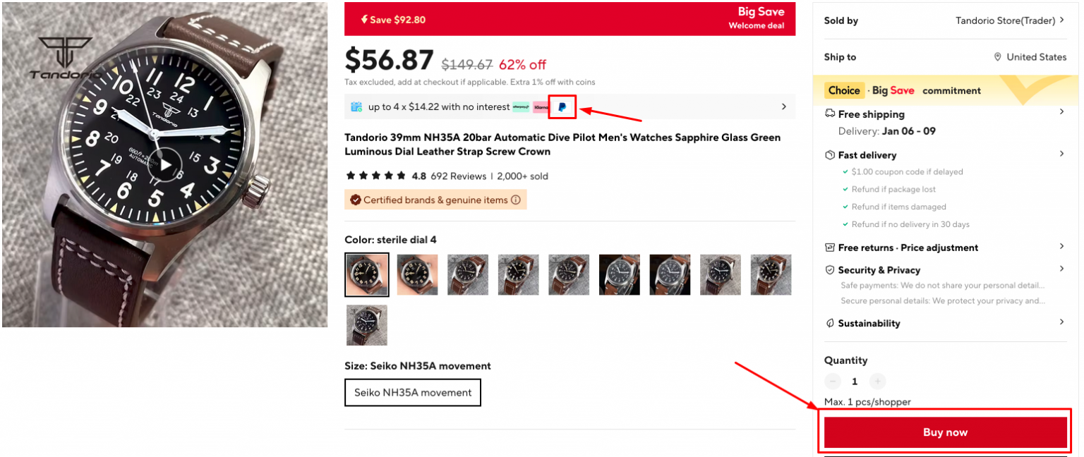 When you checked reviews and selected the product clcik “Buy now”. Here you can see all the available payment options and if PayPal is amongst them Sellers sometimes put info about payment methods on the product page, but if that is not the case, you can find this info after clicking “Buy now”